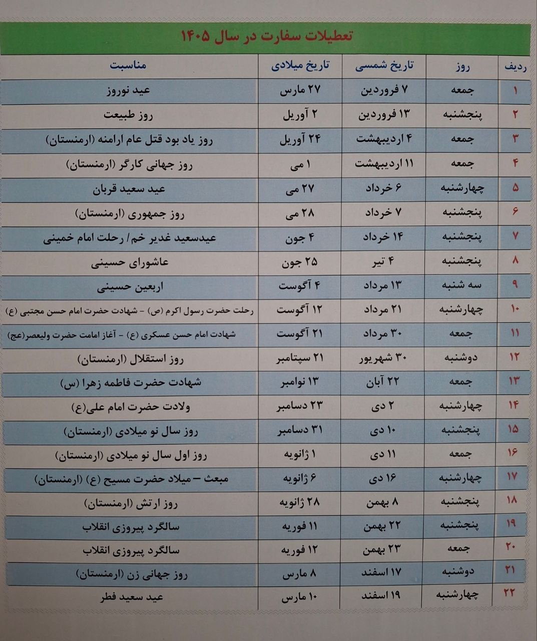 تعطیلات سفارت جمهوری اسلامی ایران در ارمنستان در سال 1405